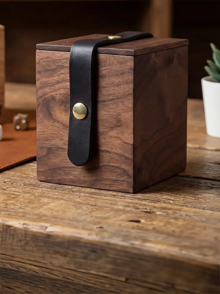 Every box is cut, finished, and inspected in my shop before it ships to you. Solid American hardwood, latigo leather from a multi-generational US tannery, and brass hardware that won't strip or snap is what makes this box exceptional.